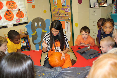 The unit this week was pumpkins, we learned about the life cycle of a pumpkin. We even watched a video clip from a pumpkin farmer who grows pumpkins that weigh over 800 pounds and makes pumpkin pies that weigh over 400 pounds!!